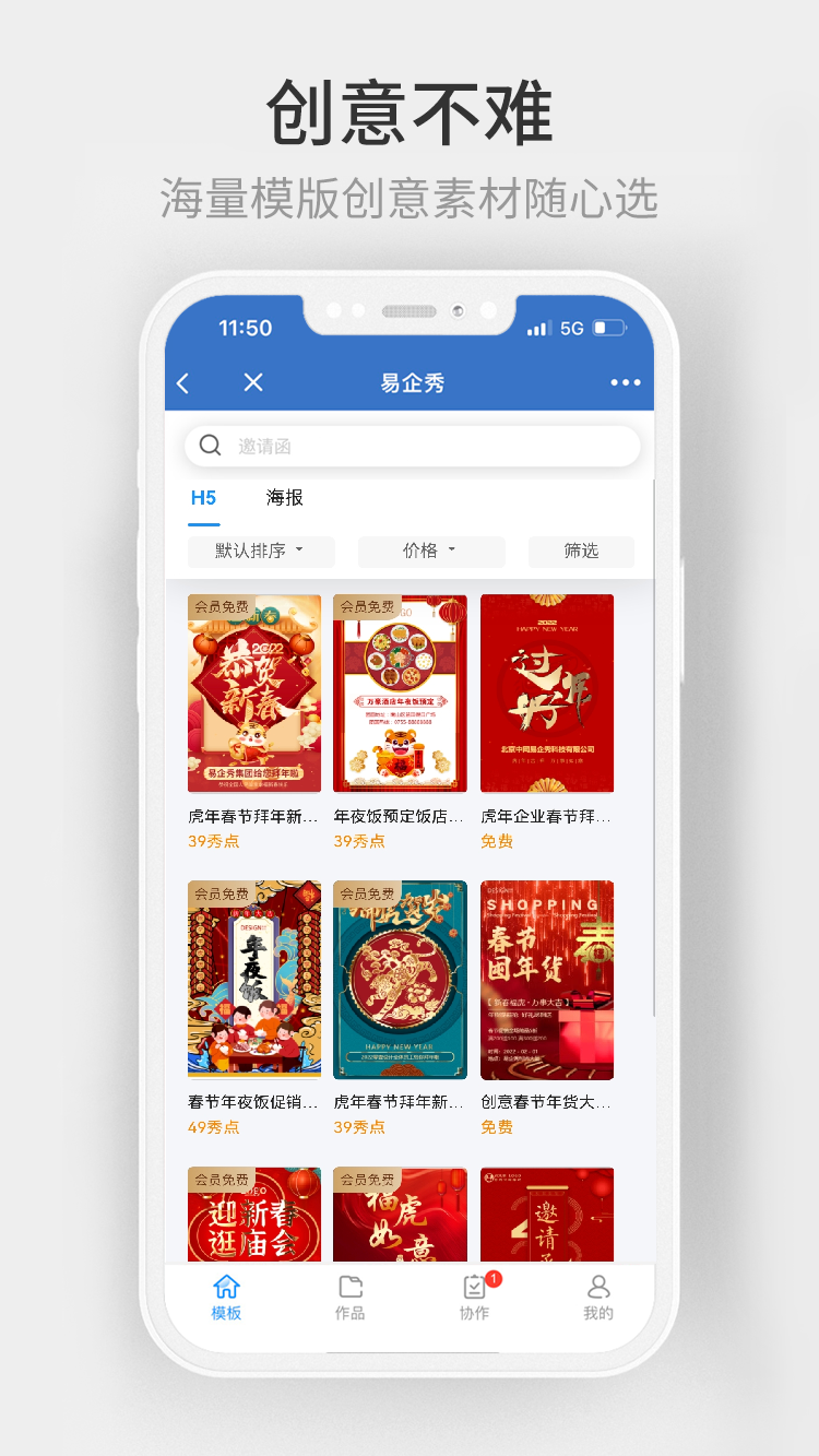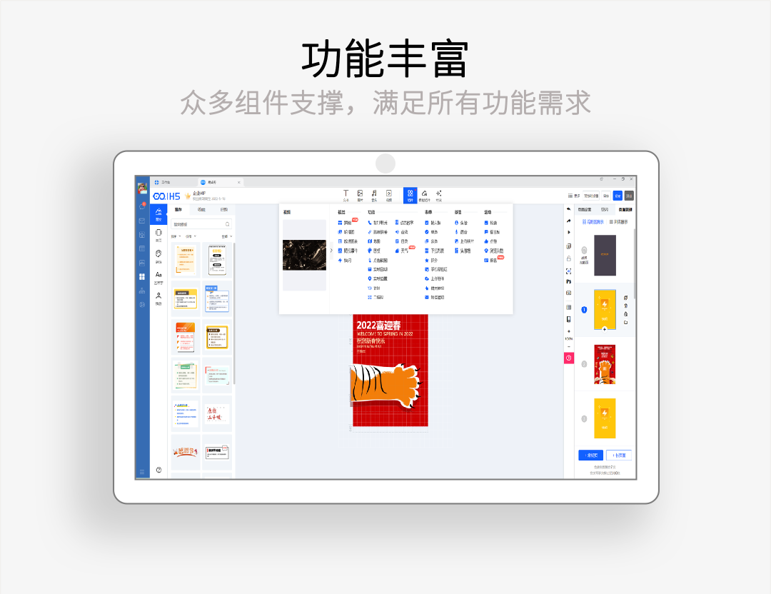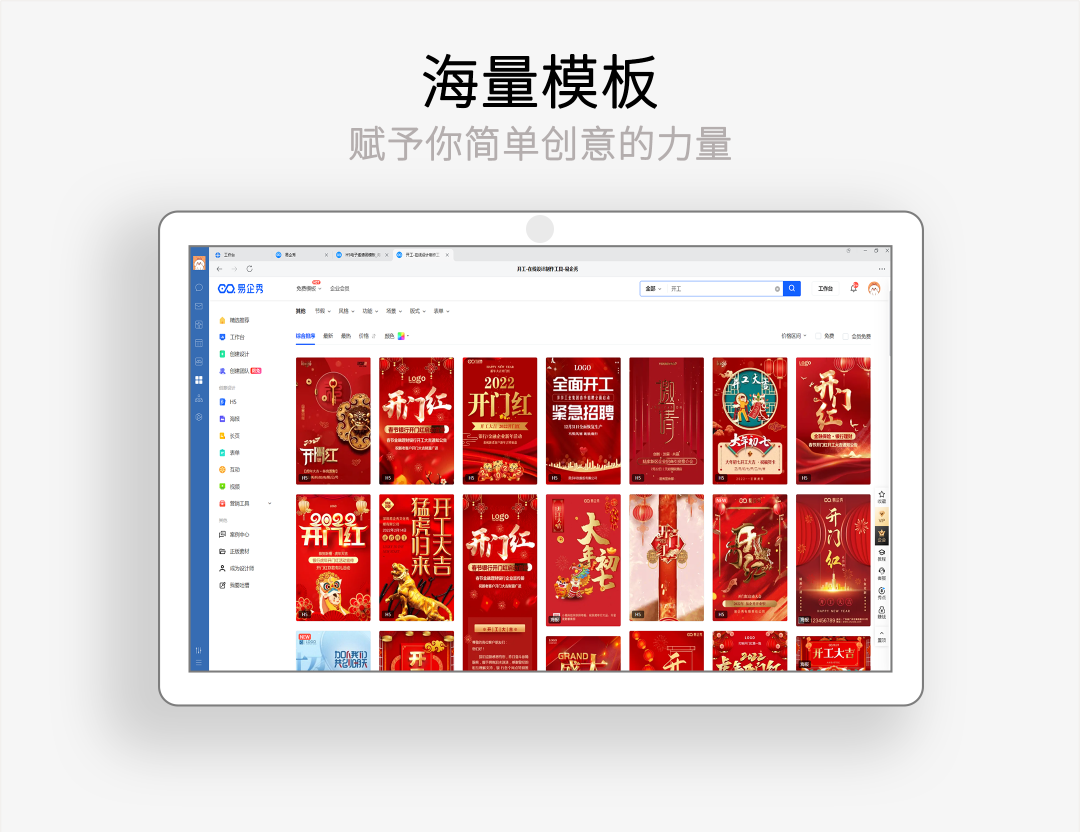 100万+海量精美模板,每日更新,热点营销不错过;25万+正版授权素材,优质字体、图片、音乐皆可商用;3分钟制作一个炫酷的创意作品,H5邀请函、海报;累计获得6000万用户的青睐。