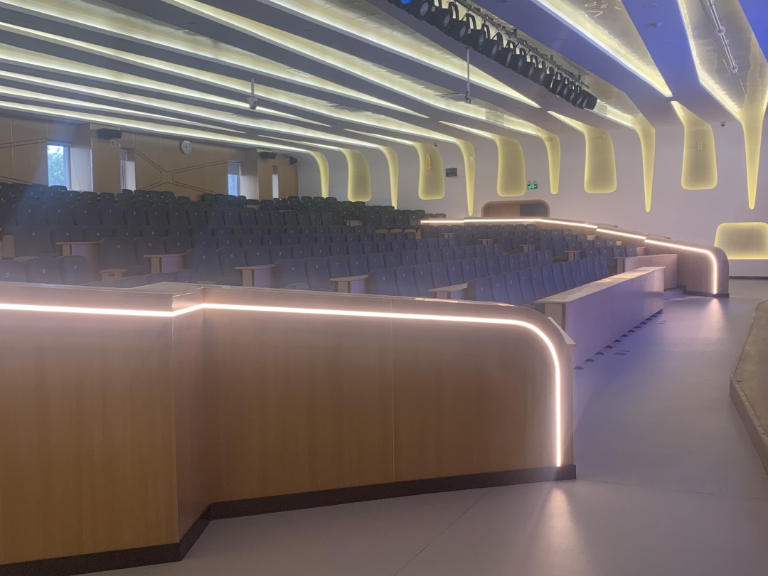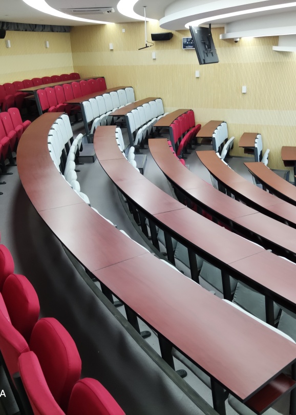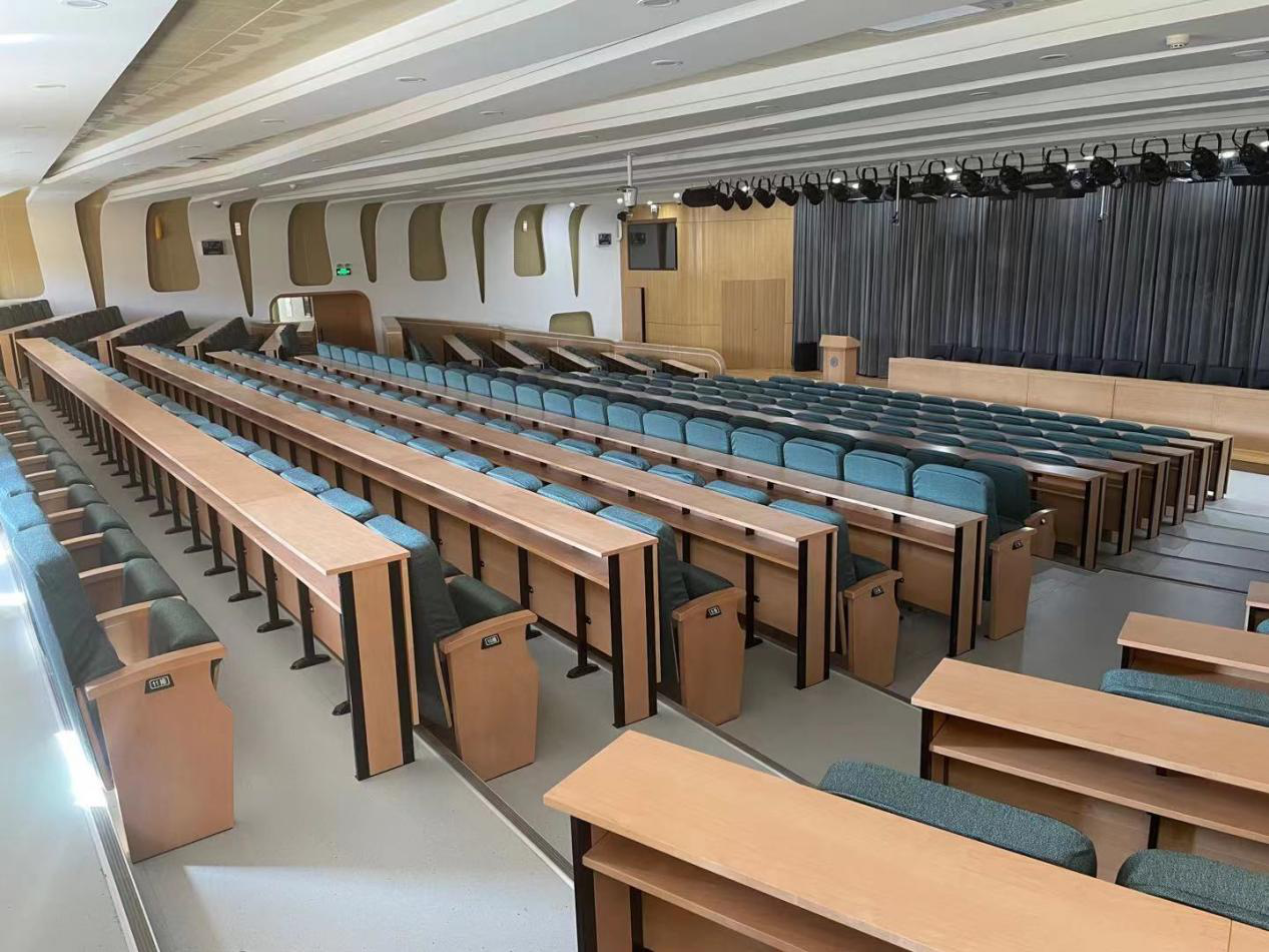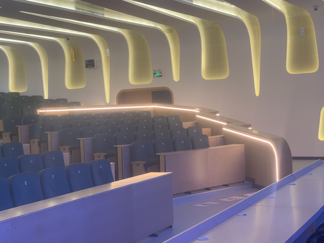 电子楼阶梯教室为小型扇形阶梯教室,可用于开展本地和远程教学、教育活动和学术报告等多种用途。教室同时具备无线投屏、环绕立体声等多项功能。教室内为固定桌椅,共159个座位。